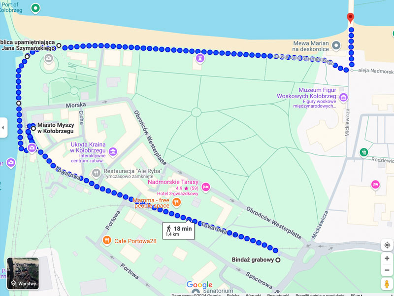 Polecamy spacer, rozpoczynając od strony Bindaża, następnie przez port i wokół Latarni Morskiej, aż do Bulwaru Jana Szymańskiego. To idealna trasa, aby w pełni docenić uroki Kołobrzegu i jego niezwykłe atrakcje. Można wstąpić z dziećmi do Miasta Myszy pod drodze.